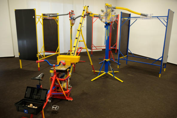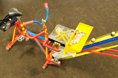 Über ein Fahrrad-Förderband mit Zuführungsautmatik werden die Kugeln in